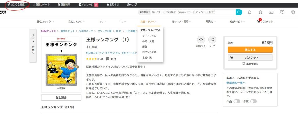 左上の赤丸がリンク作成のメニューです。これはアフィリエイト可能な商品のページにいると表示されます。